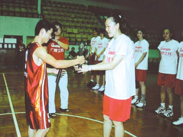 当天,在八一广博文具女篮冠名签约仪式结束后,八一女篮的姑娘们便在自家的训练营里迎接远道而来的球迷们,同他们一起度过了一个难忘的下午。双方互赠礼品后,八一广博文具女篮的姑娘们便同娘家球队来了个友谊赛。为了表现一家人的概念,球技高超的女篮姑娘们照顾球迷们的业余水准,重新规定了本场比赛的规则。这规则一公布不禁让球迷们笑开了花,原来这别出心裁的规则要求女篮姑娘们不能在篮下投球,三分球投中也只能按两分算。